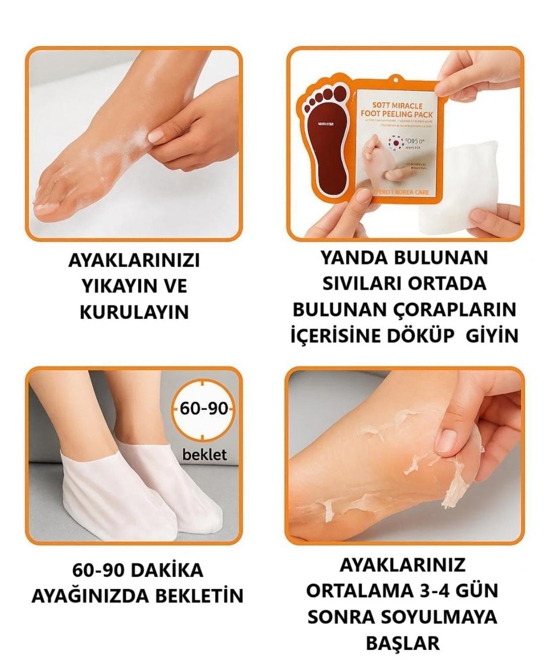 AyakTerapi peeling maskesi, sertleşmiş derileri ve nasırları nazikçe temizler. İlk haftanın sonunda, ev konforunda profesyonel bir pedikür yaptırmışçasına pürüzsüz ve yumuşak ayaklara kavuşun.